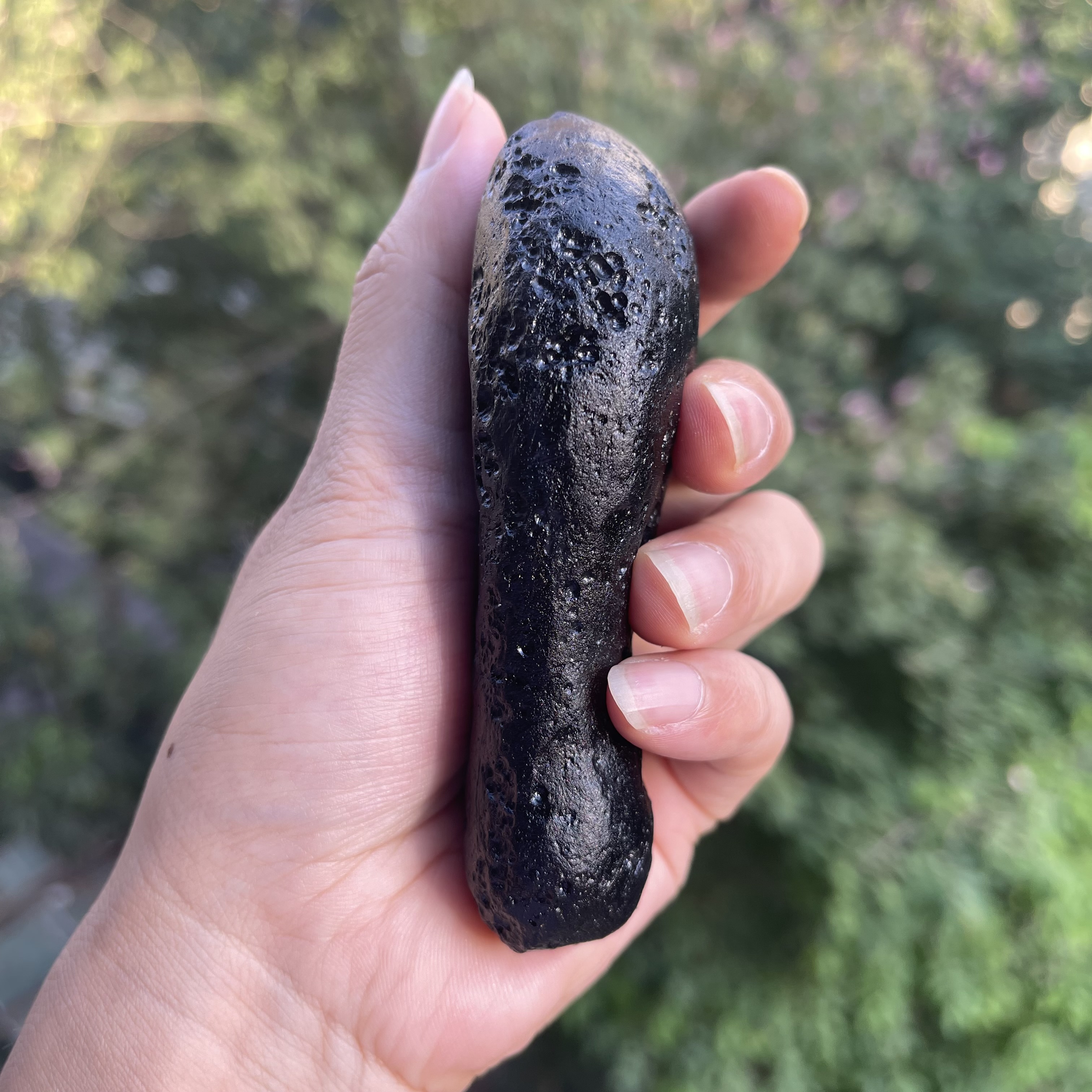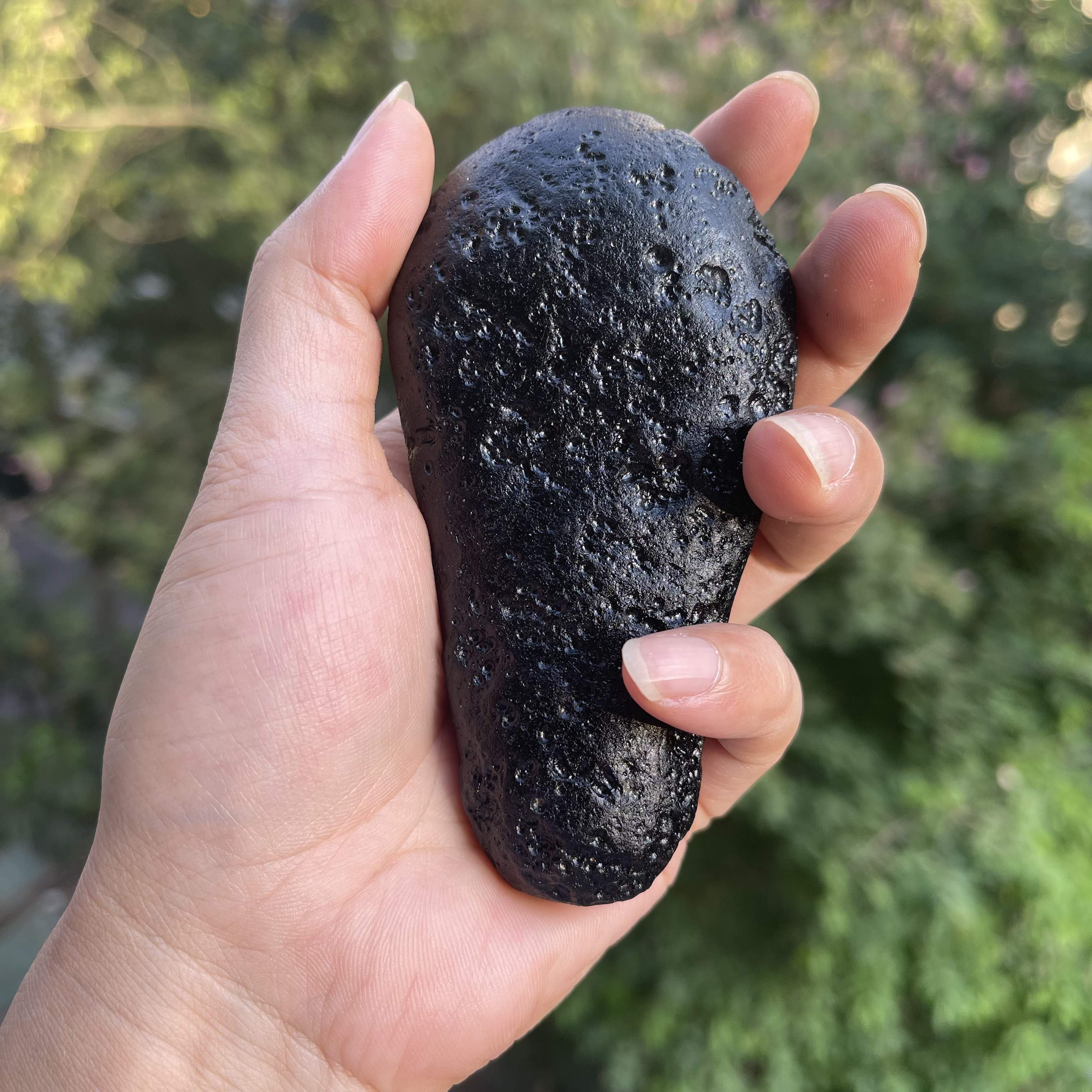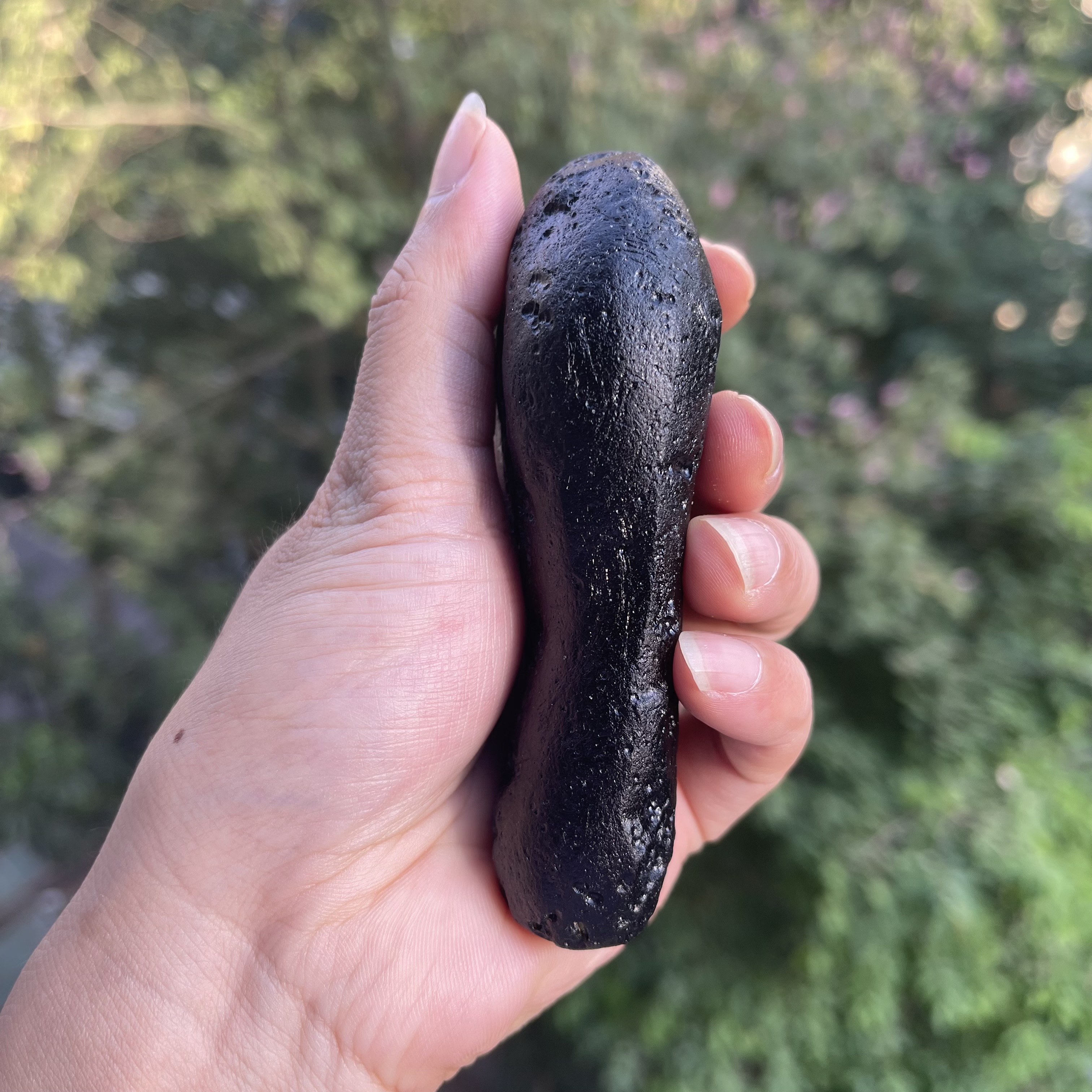 观音牌玻璃陨石雷公墨,一颗精美的手把件原石,重约206克。