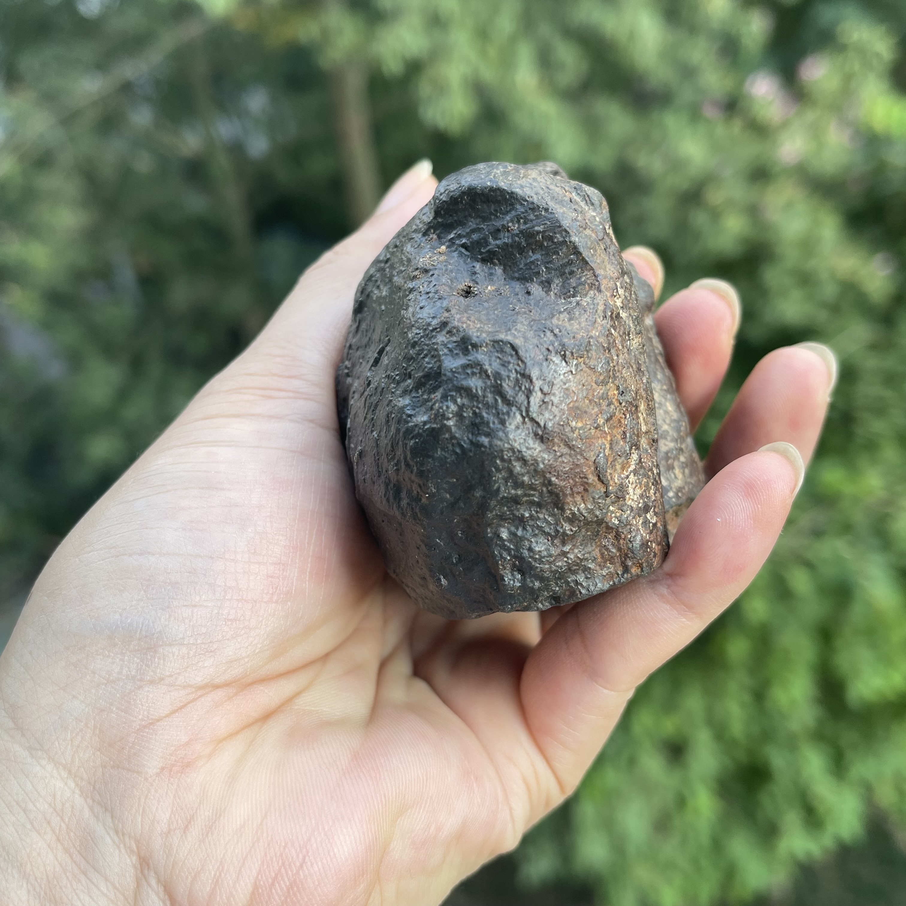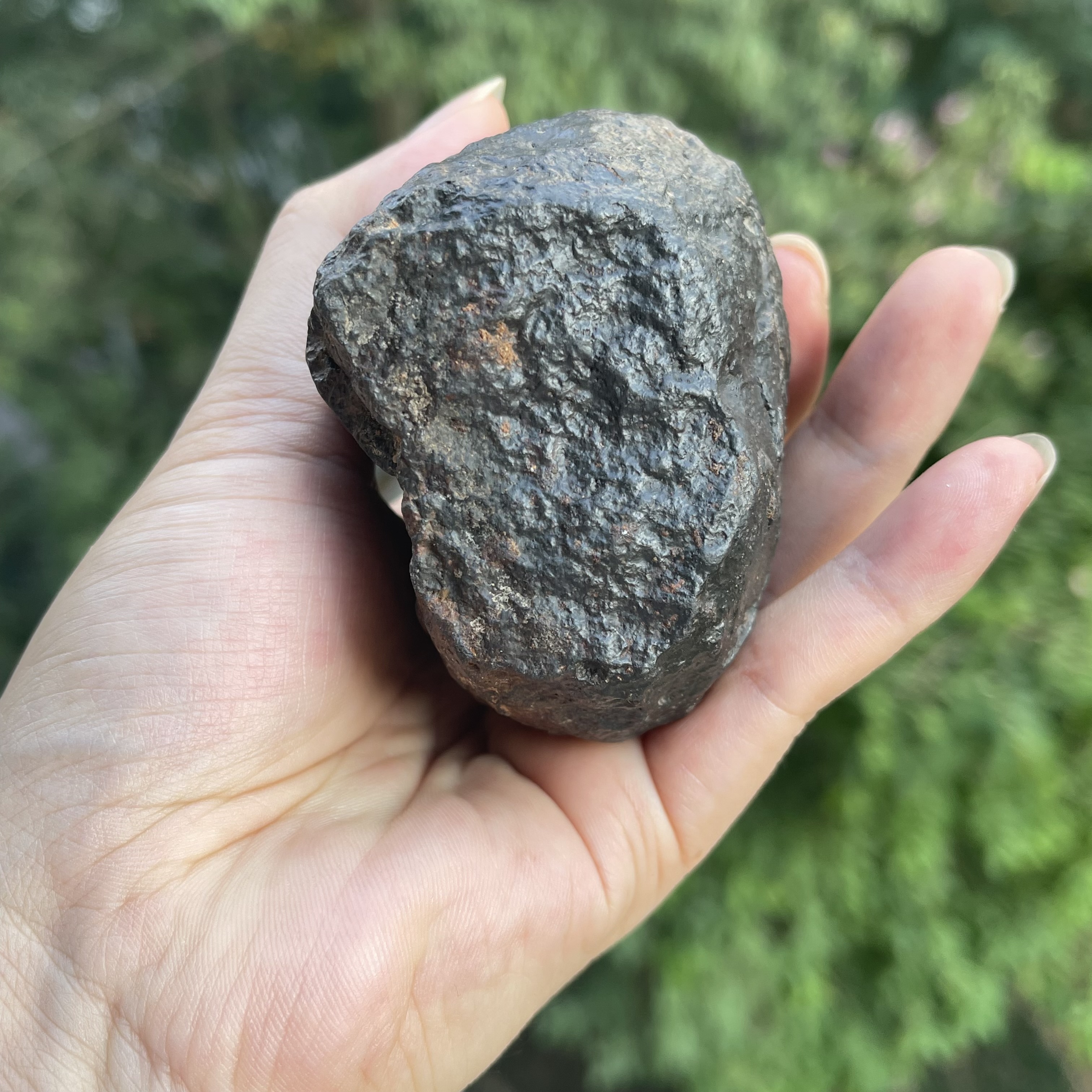 2021年发现于非洲阿尔及利亚的冲击熔融石陨石,风化面是漆黑熔壳,底部是着地面有一层锈迹,原始的味道,其重约422克。